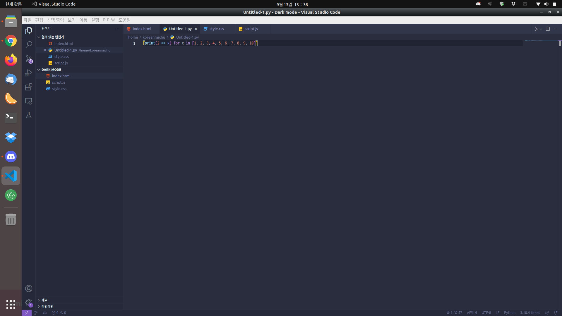 위 코드는 배열 안에 있는 수의 제곱근을 소수점 세자리까지 출력하는 코드이고, 아래 코드는 배열 안에 있는 수를 제곱해서 출력하는 코드이다. 아, 왜 **냐면 자바스크립트와 파이썬에서 ^는 XOR을 의미한다. 그래서 파이썬이나 자바스크립트로 2 ^ 2 하면 4가 아니라 0이 나온다. (XOR은 입력 두 개가 달라야 참임)
