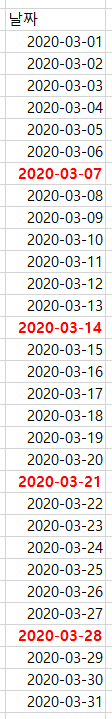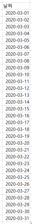 이거 일일이 쓰지 말고 저거 채우기 핸들로 쭈우우우우우우우우욱 드래그해서 2020년 3월 31까지 만들어보자.