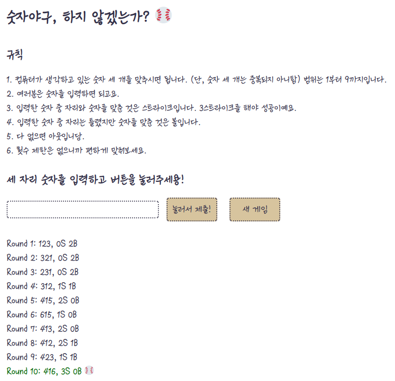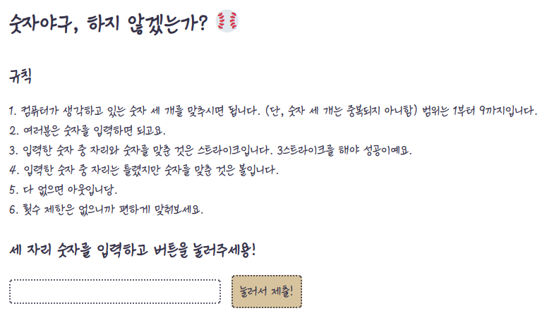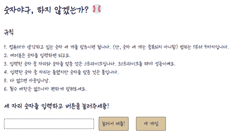 여기서 숫자 야구를 만들었는데, 생각해보니까 새 게임 버튼이 있었으면 좋겠는거다. 아니 새 게임 할라면 F5키 누르면 되긴 됩니다. 어차피 창 새로고침 하면 되니까. 근데 있으면 재밌잖아요? 그리고 이 새 게임 버튼은 조건부로 나오는거라서 게임을 클리어해야 나온다.