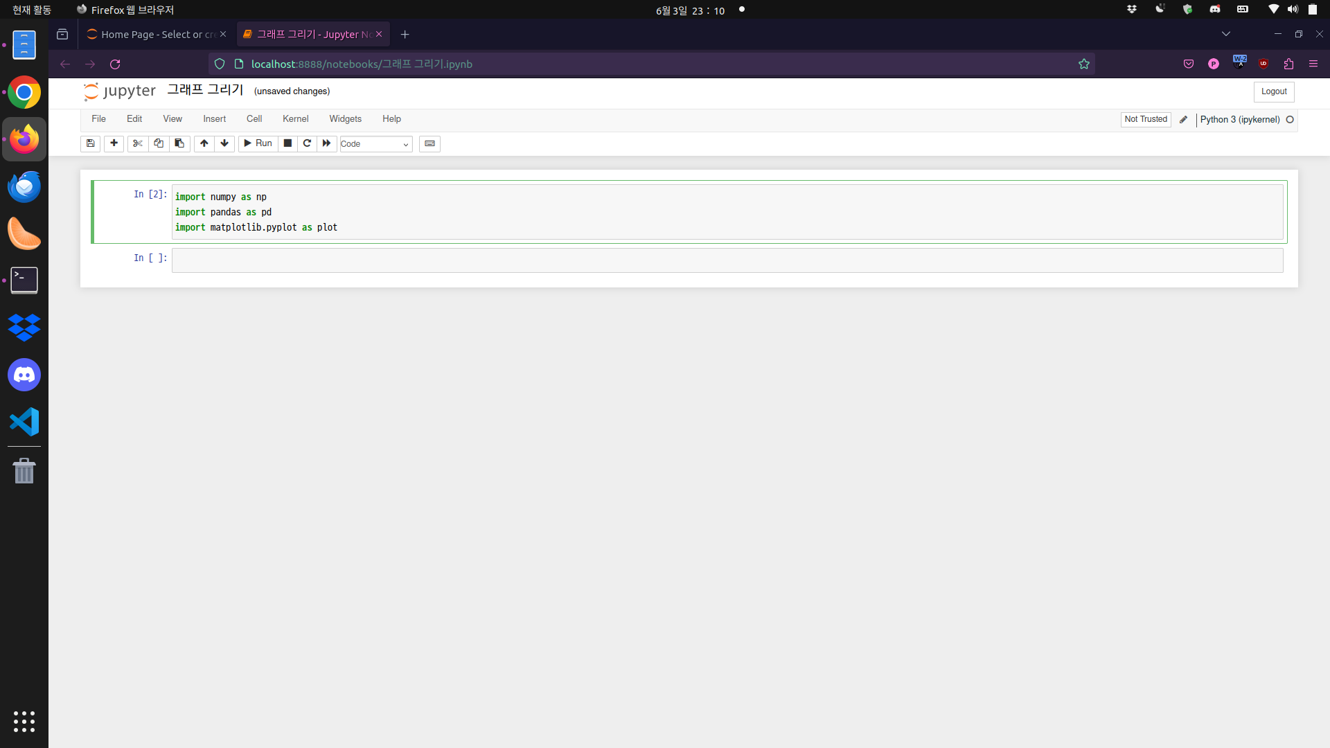 일단 이번에는 VScode가 아닌 다른 걸 켜볼건데… 바로 Jupyter이다. 얘가 칸단위로 처리할 수 있어서 개편합니다. 그래서 Jupyter, Numpy, Pandas, Matplotlib까지 설치하고 오시면 됩니다.