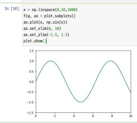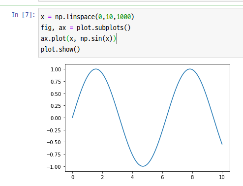 linspace는 넘파이에 있는건데, 저게 무슨 뜻이냐면 1) 0부터 2) 10까지 3) 간격 1000으로 나눠달라 는 얘기다. 두번째줄 저거는 뭔진 모르겠는데 있어야 그려주데… 그리고 세번째줄은 y=sin(x)의 그래프를 그려달라는 얘기. 마지막줄은 그렸으면 보여달라는 얘기다.