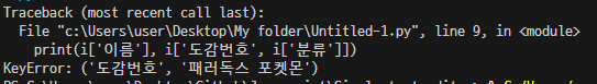 print(i['이름'], i['도감번호'], i['분류'])