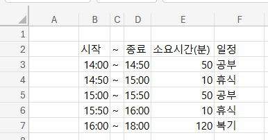 이런 식으로 시작시간, 종료시간이 별도의 셀에 들어있는 경우에만 활용 가능하다.