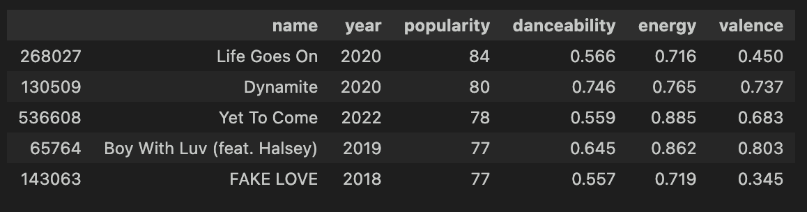mj_the_one = song_df[song_df['artists'].str.contains('BTS', case=False, na=False)].sort_values('popularity', ascending=False)
