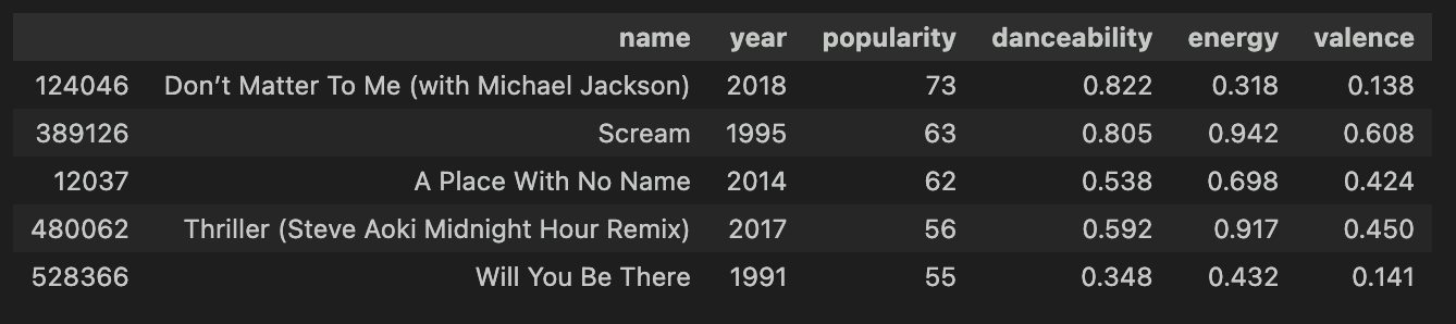 display(mj_the_one[['name', 'year', 'popularity', 'danceability', 'energy', 'valence']][0:5])