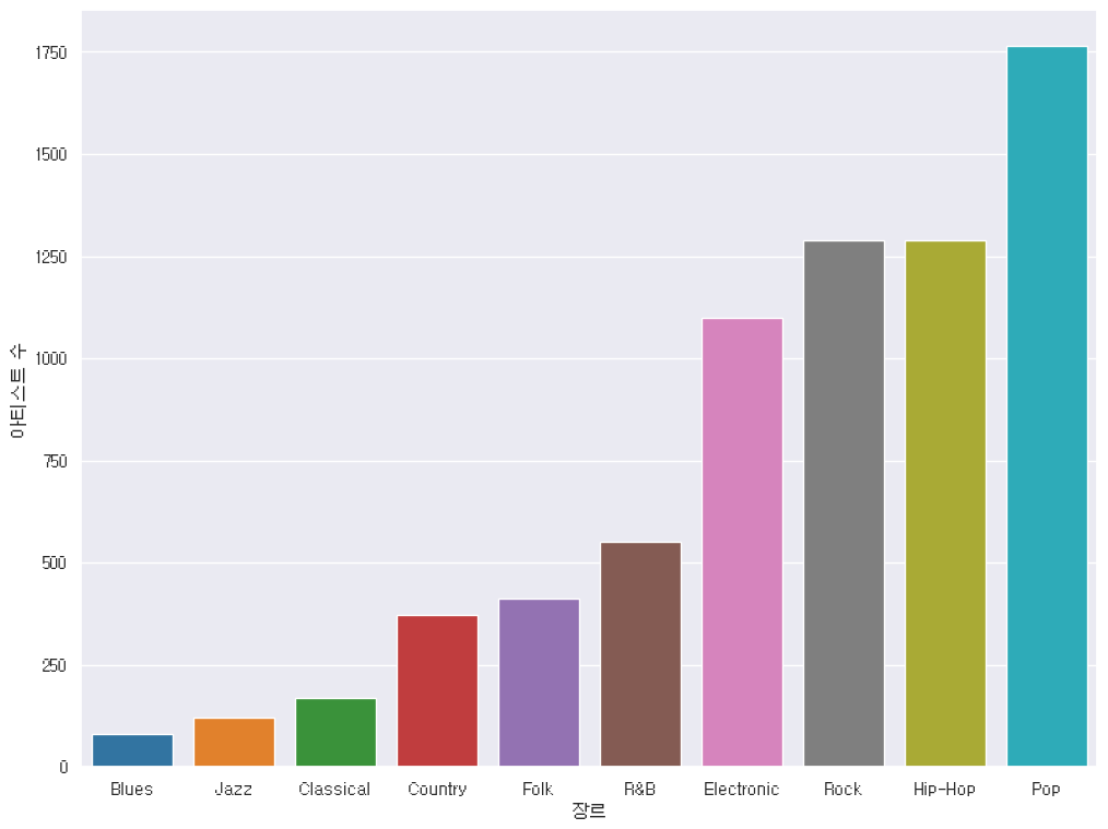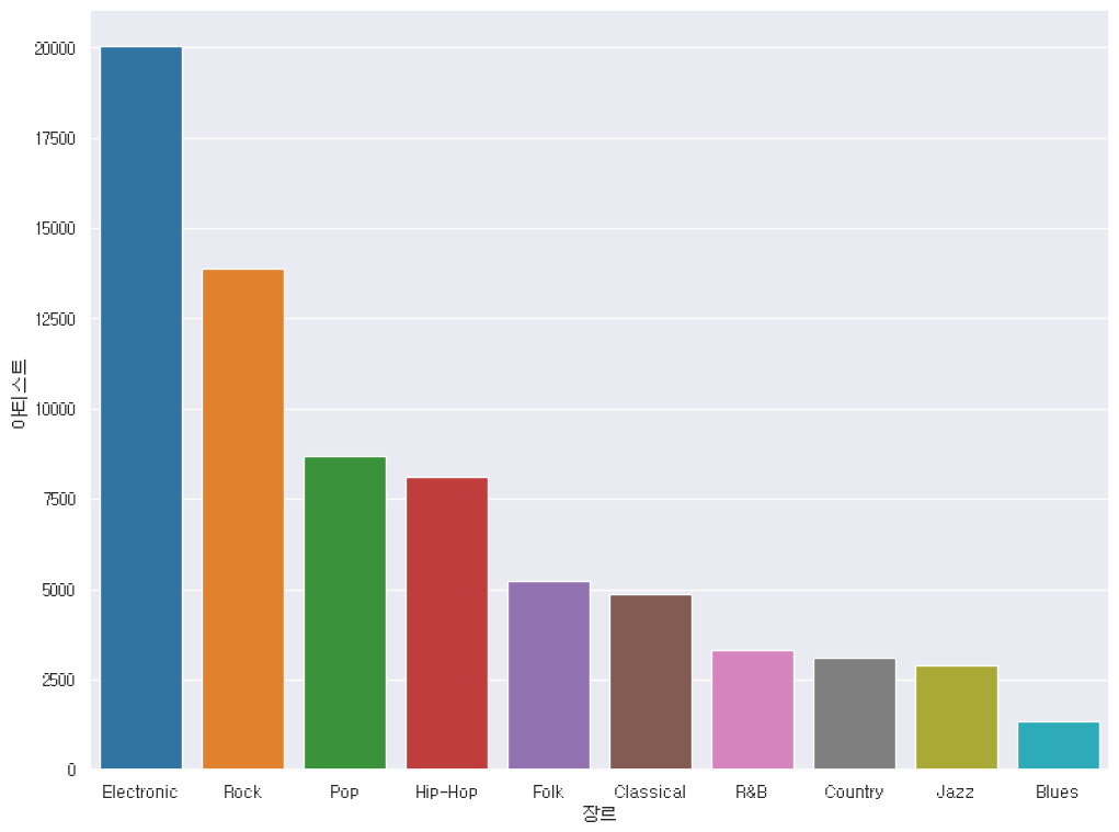 일단 장르별 팔로워 수는 일렉트로닉이랑 락이 많구만... 인기도도 또이또이다.
