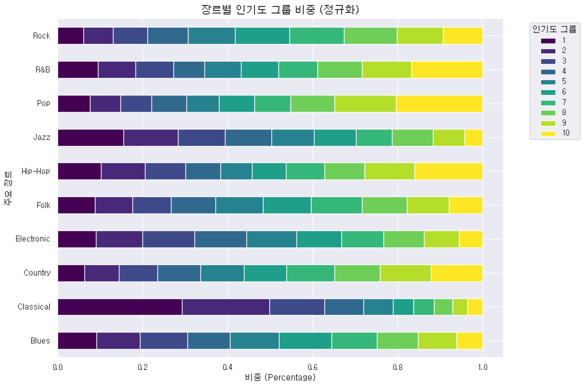 plt.title('장르별 인기도 그룹 비중 (정규화)', fontsize=15)