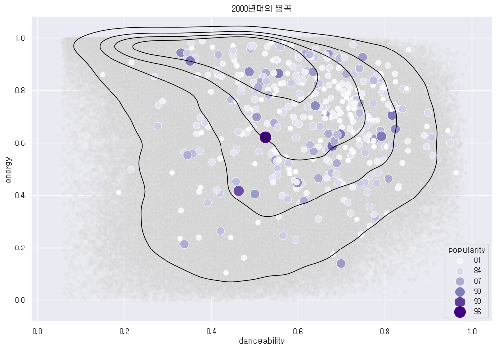 이건 KDE 등고선 추가 버전. 이걸 2000년대 곡들에도 할거다.