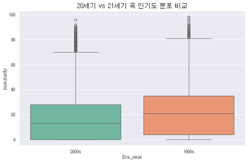 plt.title('20세기 vs 21세기 곡 인기도 분포 비교', fontsize=16)