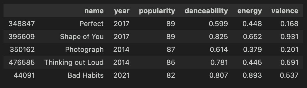 mj_the_one = song_df[song_df['artists'].str.contains('Ed Sheeran', case=False, na=False)].sort_values('popularity', ascending=False)