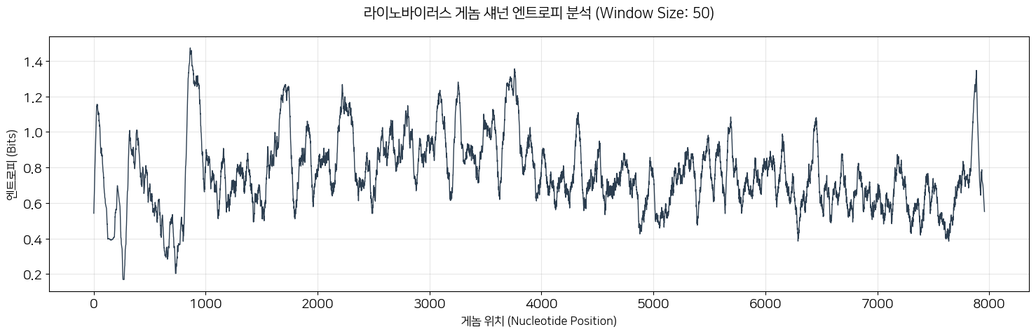 plt.title(f'라이노바이러스 게놈 섀넌 엔트로피 분석 (Window Size: {window_size})', fontsize=15, pad=20)