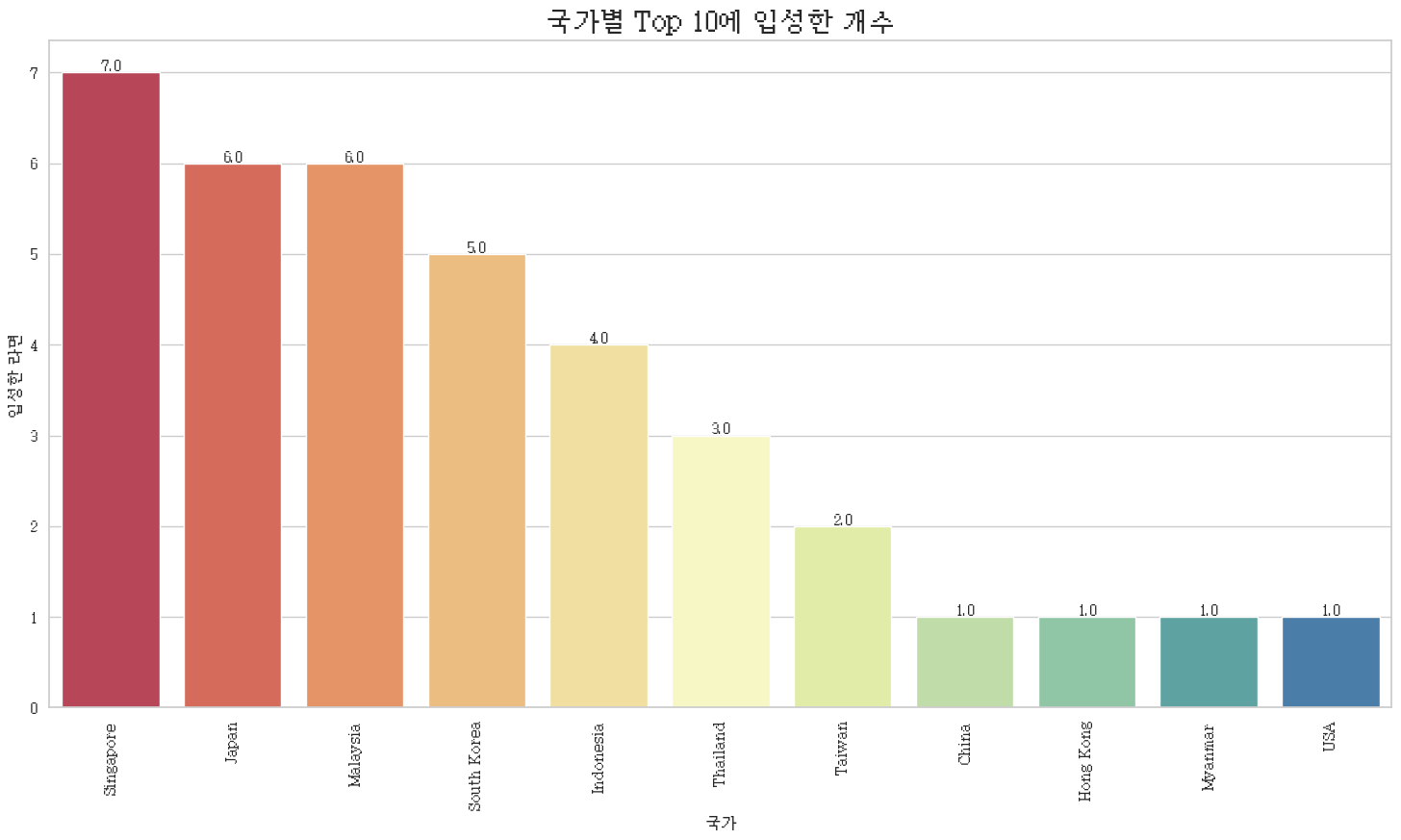 print("Top 10에 선정된 봉지라면들의 국적 분포:")