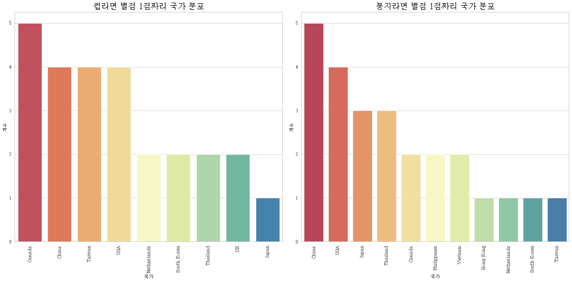 ax[1].set_title('봉지라면 별점 1점짜리 국가 분포', fontsize = 20)