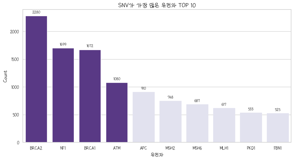 plt.title('SNV가 가장 많은 유전자 TOP 10')