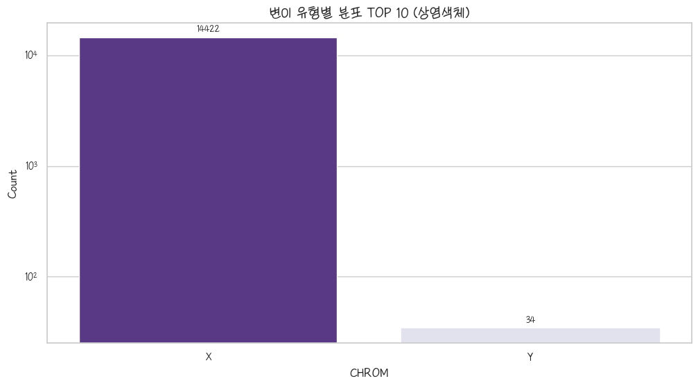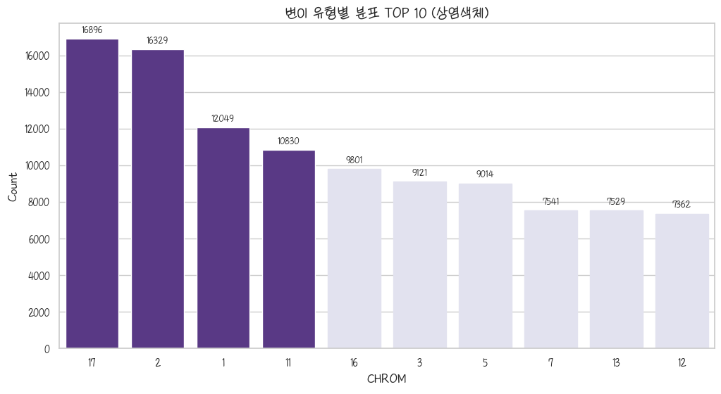 plt.title('변이 유형별 분포 TOP 10 (염색체별)')