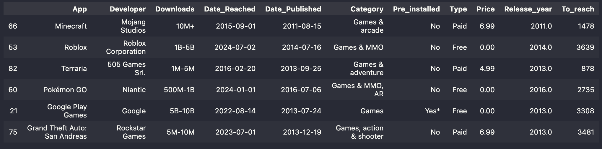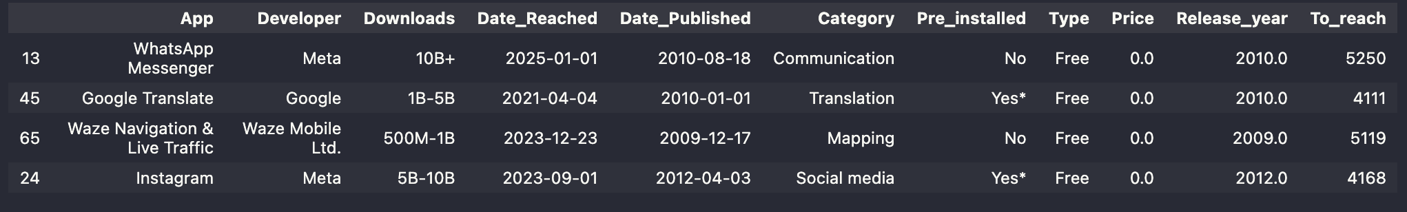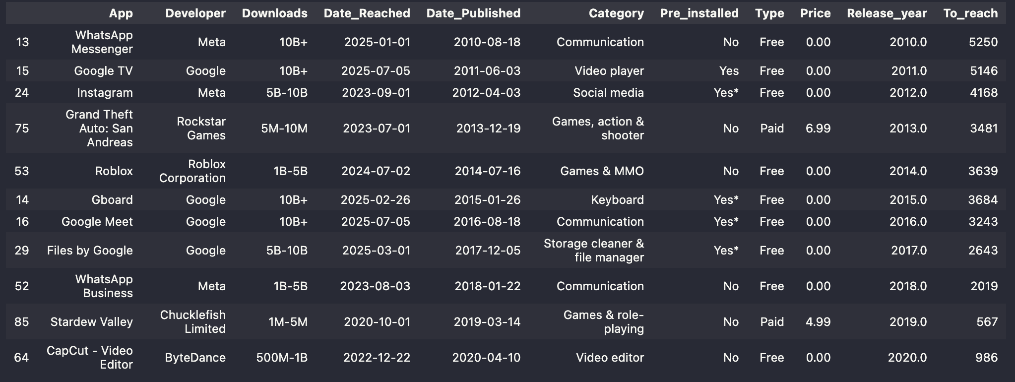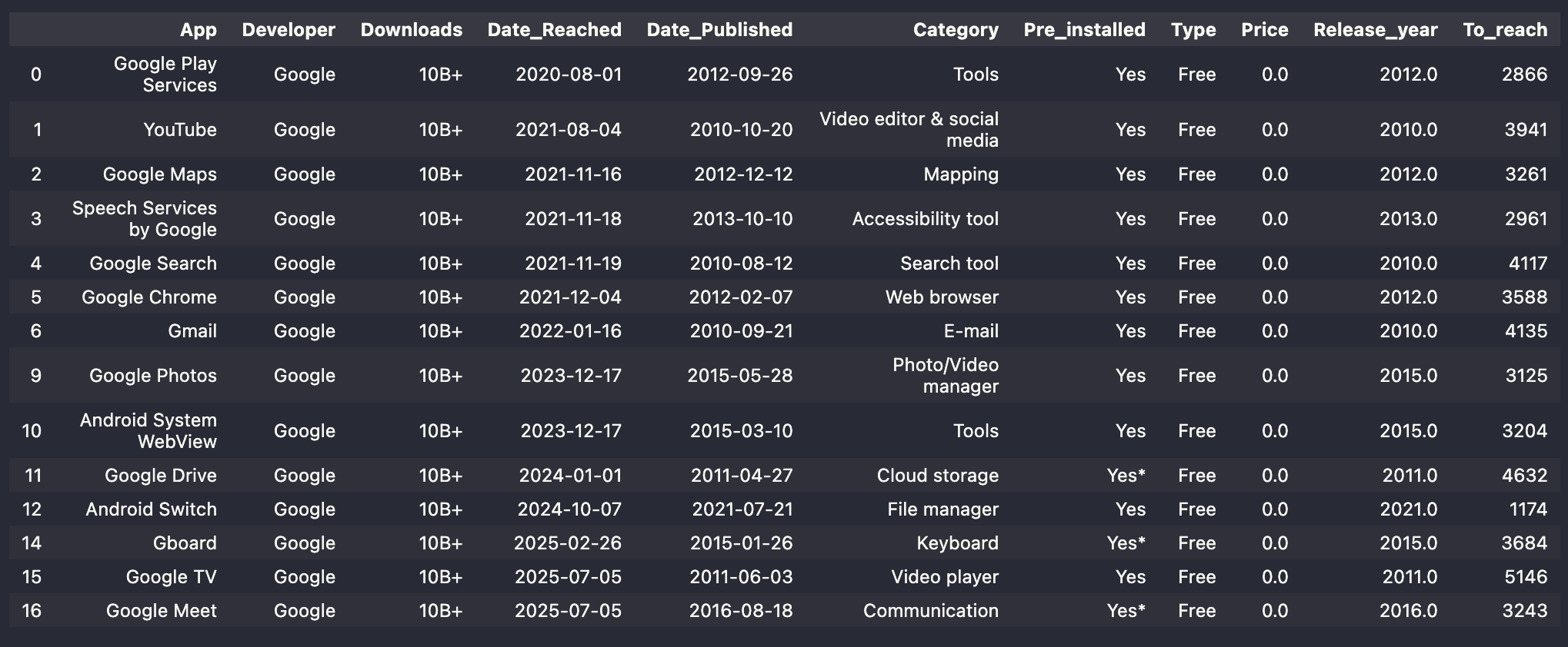 App Developer Downloads Date_Reached Date_Published Category Pre_installed Type Price Release_year To_reach