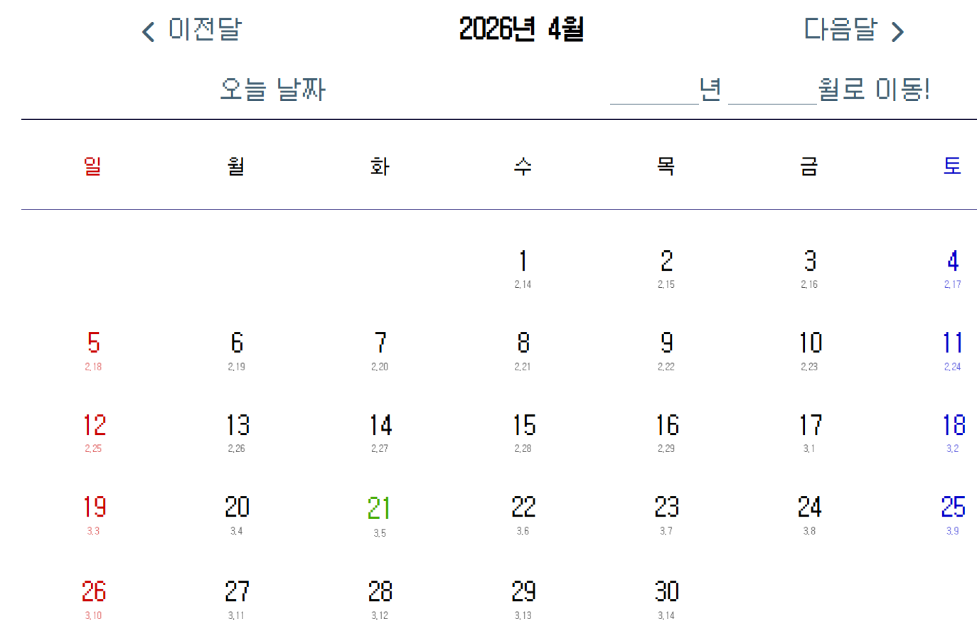 그새 글꼴이 많이 바뀌긴 했는데... 그래서 이 달력에 뭔 기능을 추가할거임? 바로 오늘 날짜로 되돌아가는 기능과 몇년 몇월로 이동하는 기능이다. 전자는 뭔지 알겠는데 후자는 뭐임? 여러분 이 달력에서 1991년 3월로 어떻게 가는지 아십니까? 1991년 3월 될때까지 이전달을 급나 눌러야됩니다. 일단 햇수로만 36년인데 1년이 12개월이니까 대충 클릭질 몇 번 해야 하는지 견적이 나오시죠?