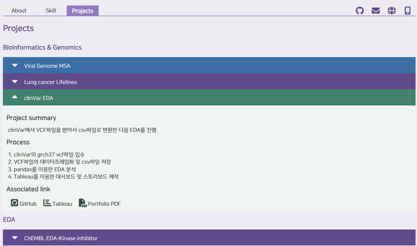 저기는 아코디언 패널인데 지금까지 한 프로젝트들이 들어갑니다. 저기에는 생물쪽 한 거+부트캠프 팀플(아직 안 넣음)+생물학이 아닌 다른 EDA도 같이 들어가는데… 예, 그 캐글 EDA도 들어갑니다… 근데 여기서는 그림 안 넣고, 그냥 프로젝트에 대한 개요(이런거 했다)만 올린 다음 PDF를 올리거나 깃헙으로 유도할 예정임. 그래서 프로젝트 요얄이랑 과정만 있잖아요.