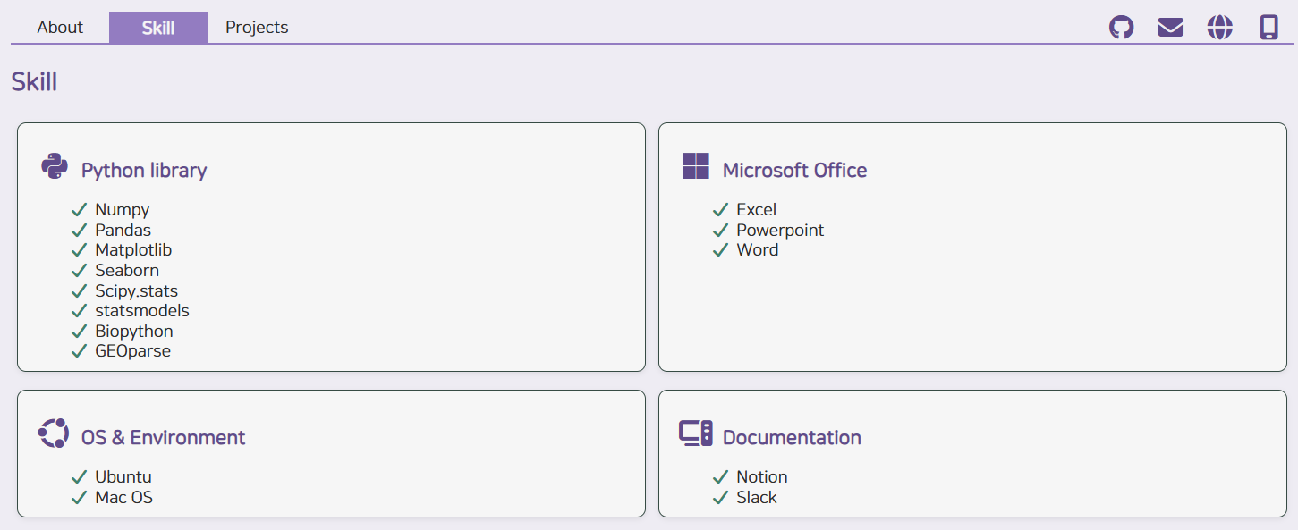 2. About에는 본인 약력, 자격증이 들어가고 skills는 뭐 할 수 있냐고 project에 개인적으로 했던 모든 프로젝트들이 들어갈 예정이다.