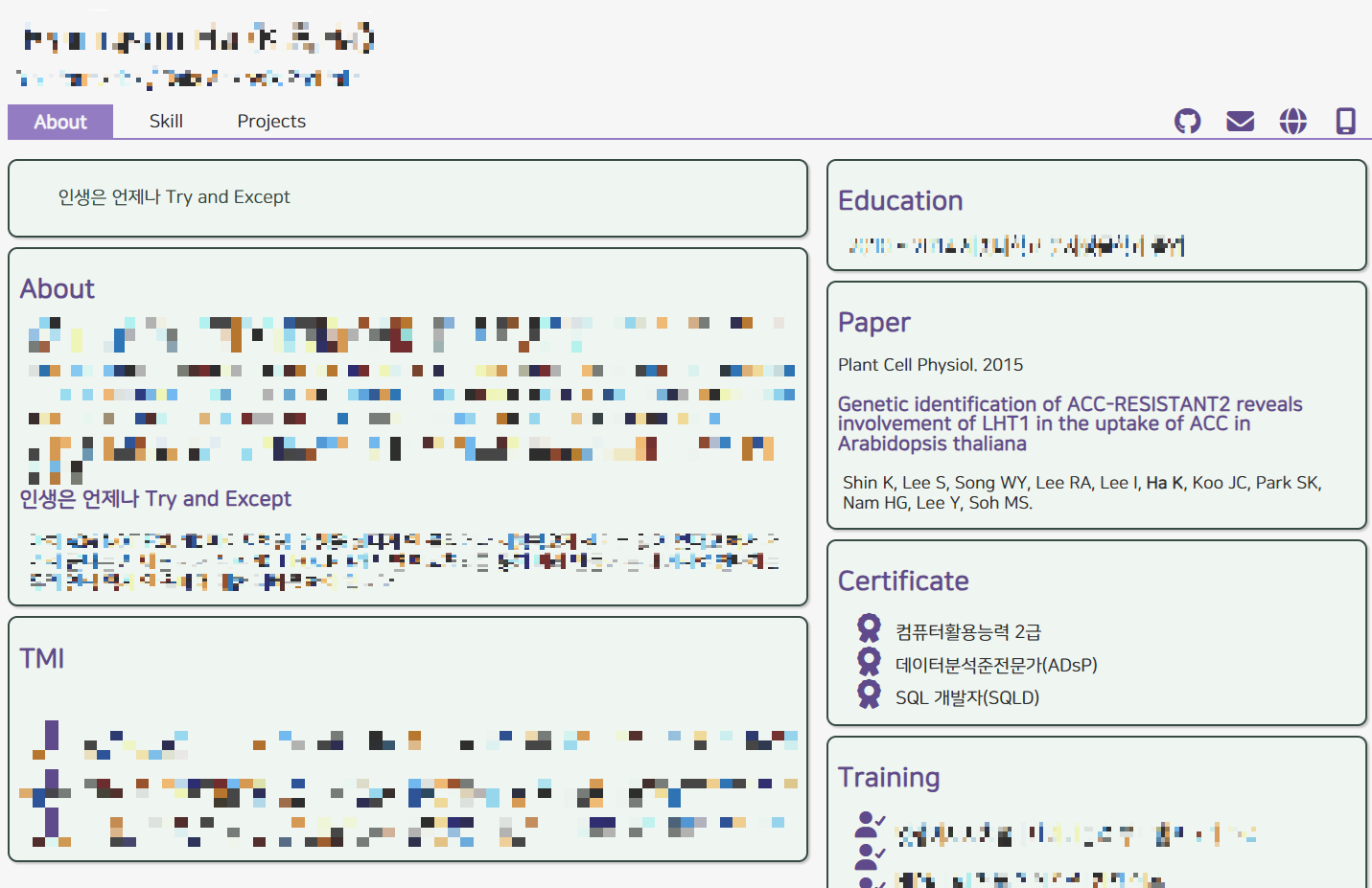 뭘 많이 가렸죠? 다 개인정보라 어쩔 수 없음.. 그럼 논문하고 자격증은 왜 안 가렸냐… 논문은 이미 저널에 실린거고 자격증도 내가 땄다고 올렸잖아요. 쟤들은 이미 한번 깐거라 안 가린거임.