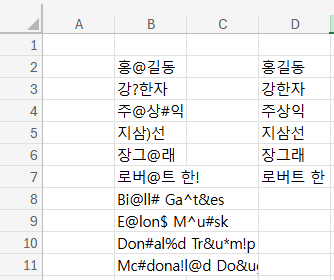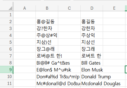 한글에 대응하는 정규식 토큰을 쓰면 된다. =REGEXREPLACE(B2,"[^ㄱ-ㅎ|ㅏ-ㅣ|가-힣| ]","")에서 [ㄱ-ㅎ|ㅏ-ㅣ|가-힣]이 한글에 대응하는 토큰이고 ㄱ 앞에 붙어있는 ^는 얘네 빼고라는 의미이다. 저 작대기는 쉬프트+\ 하면 입력할 수 있는 막대기인데, 의미는 OR이다. 그니까 대괄호 안에 있는 건 이거 혹은 이거 혹은 이거 빼고라는 얘기. 근데 뒤에 공백은 왜 들어갔냐면 로버트 한 이름이 공백이 있어서...