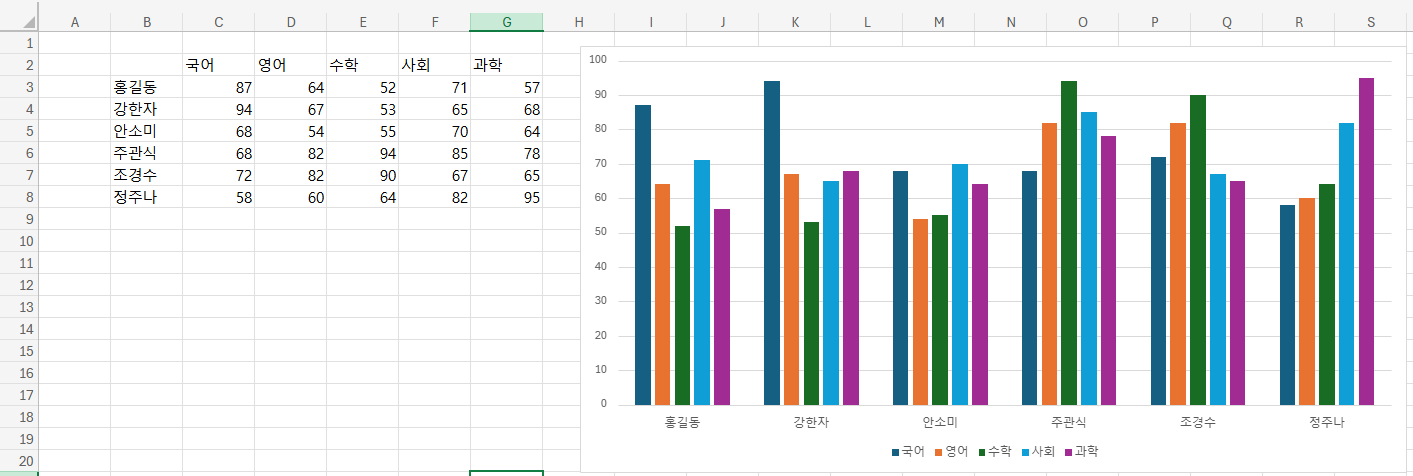 근데 막대가 쏠려서 안이쁜게 함정... 위 사진에서 국영수만 그렸던 그래프도 보면 오른쪽이 비어있는데, 사회/과학 자리다.