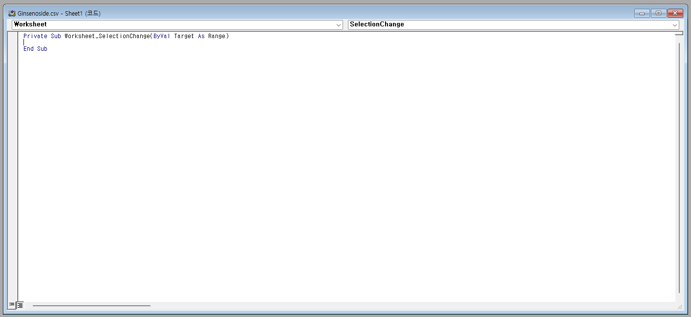 시트명을 우클릭하고 코드 보기로 가면 (일반)이 열릴것이다. 그 드롭다운 메뉴를 눌러서 Worksheet로 가자. 그리고 두번째줄에 Activecell.calculate를 입력하고 닫으면 된다.