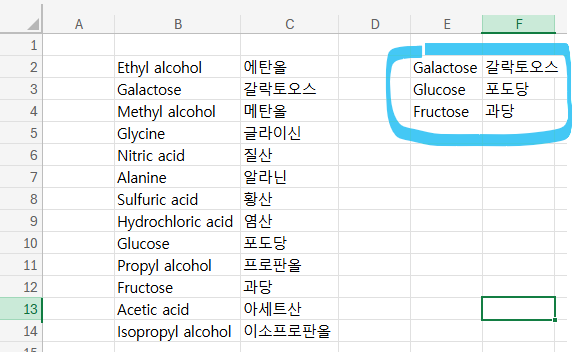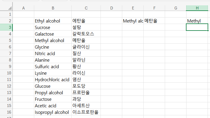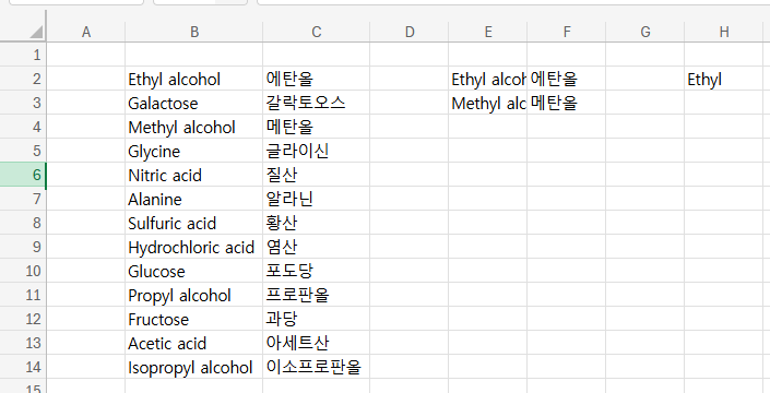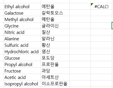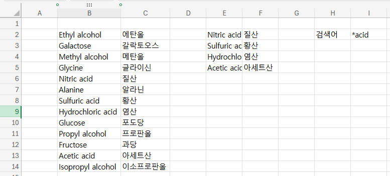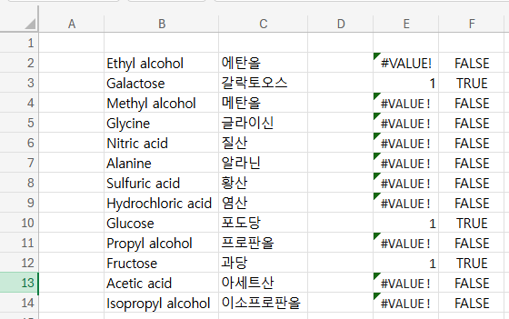 SEARCH함수를 FIND함수로 바꿨더니 정확하게 에탄올 메탄올만 찾아준다. 단, FIND함수는 와일드카드를 지원하지 않기 때문에 와일드카드 사용 시 오류가 뜬다.