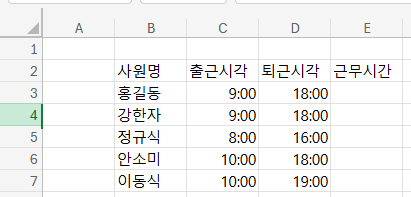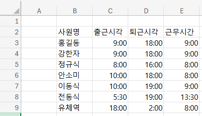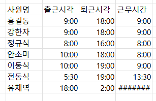 근무시간이 다음날로 넘어가면 계산이 안된다. 저거 공간 없어서 ######뜬 줄 알고 셀 확장했더니 #만 주구장창 나온다.