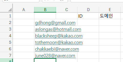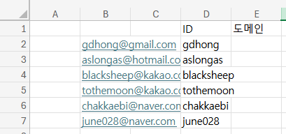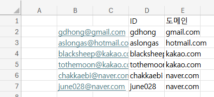 아이디는 =REGEXREPLACE(B2,"@[a-z|A-Z|.]+","")으로 뒷부분을 떼버렸다. 골뱅이랑 영어+닷까지 대체된거 맞다. 혹시 도메인에 숫자가 포함된 경우가 있다면 토큰을 [0-9|a-z|A-Z]로 하자.