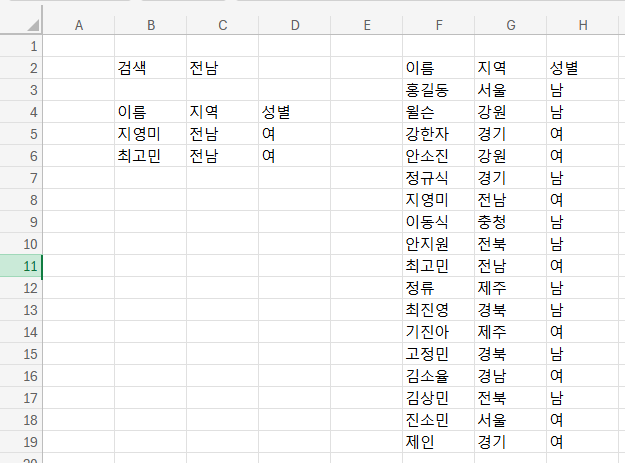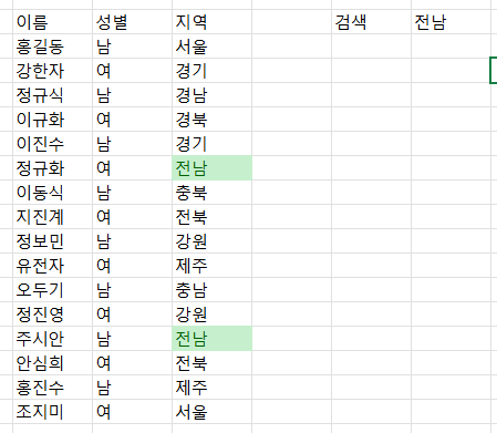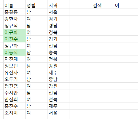 여기서는 FILTER함수를 이용해서 원하는 내용만 표시했는데, 이번에 할 건 그런 게 아니라 검색하고자 하는 것만 강조하는거다. 그렇다는 건 조건부서식을 준다는 얘기이기도 하다.