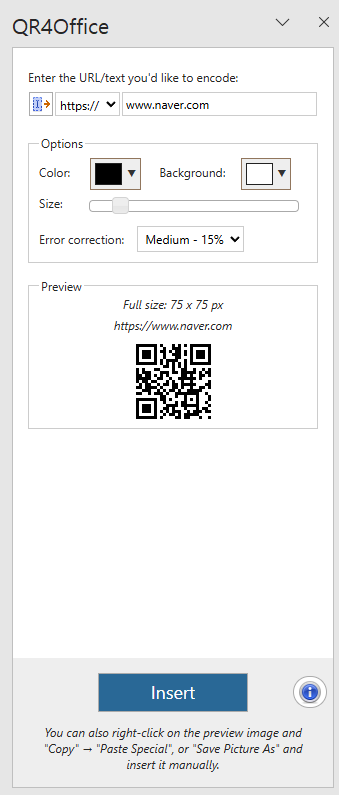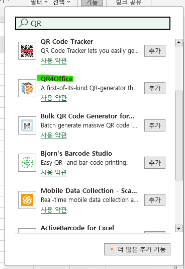 QR4office를 설치하면 이미지 형태긴 하지만 QR코드를 만들어서 넣을 수 있다. 저기 오빠두엑셀에 있는건 나도 뭔지 모르겠음.