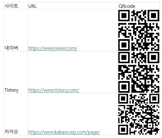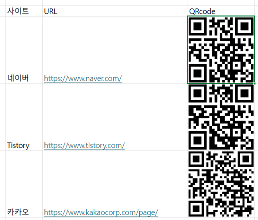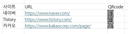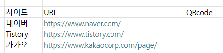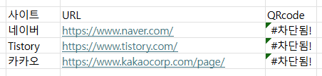 저 site에 URL이 적힌 셀을 대체했다. 이게 함수를 풀로 써주고 싶은데 자꾸 자동으로 링크로 변환해서 안되겠음... 근데 이렇게만 하면 QR코드가 생기나요? 아니다.