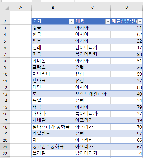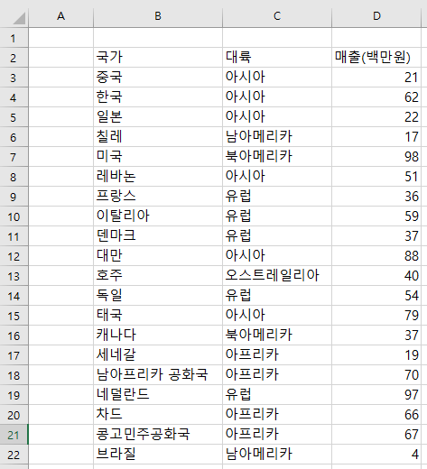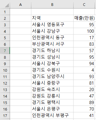 이런 식으로 있는데 서울시 매출 합쳐달라고 하면 아 이거... SUMIF 쓰면 되나...? 그럼 저거 다 서울시만 가져와야겠네? 아니 그니까 그럴 필요가 없다 이거다.