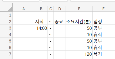 이런 식으로 시작시간, 종료시간이 별도의 셀에 들어있는 경우에만 활용 가능하다.