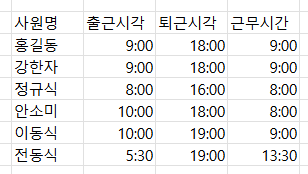 여기 근무시간 표가 있다. 그러면 근무시간을 어떻게 계산하느냐... 어? 저거 걍 뒤에서 앞에꺼 빼면 안돼요?