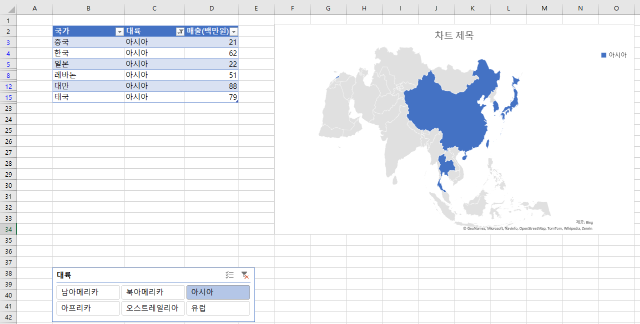 슬라이서를 삽입해주면 대륙별로 볼 수 있음. 근데 나는 왜 영상이랑 달리 크기 고정이 안될까...