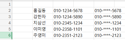 여기 전화번호가 있다. 여기서 가운데 숫자를 REGEXREPLACE 함수를 이용해 ****로 바꿔볼거다.
