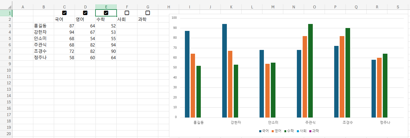 국어 영어 수학만 보기 위해 위 체크박스를 국영수에만 뒀더니 국영수만 그래프로 나타났다.